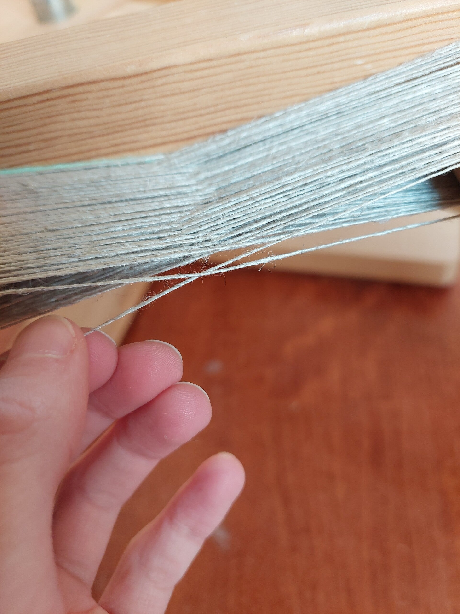 Een vrolijk bundeltje bundels van linnen kettingdraden. Hier wordt je toch blij van!