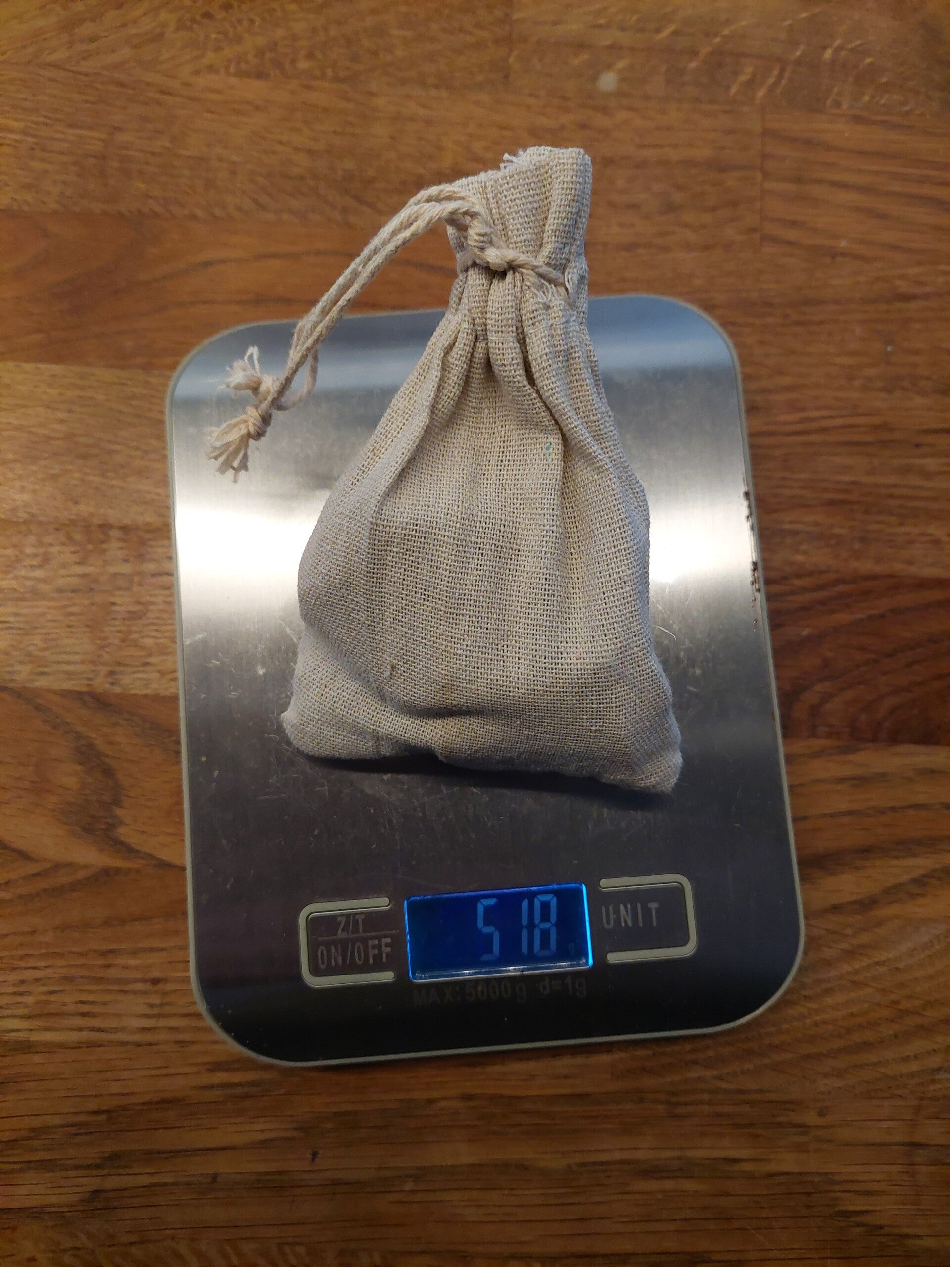 Links: een zakje met gewicht van ongeveer 500 gram. Hier zitten granaatscherven in. Wat!? Ja. Granaatscherven. Het grote voordeel van een vriend hebben die met de metaaldetector er op uit gaat is dat hij vaak thuis komt met granaatscherven, deze zijn geheel ongevaarlijk en behoorlijk zwaar. Ideaal voor mijn gewichtzakjes!