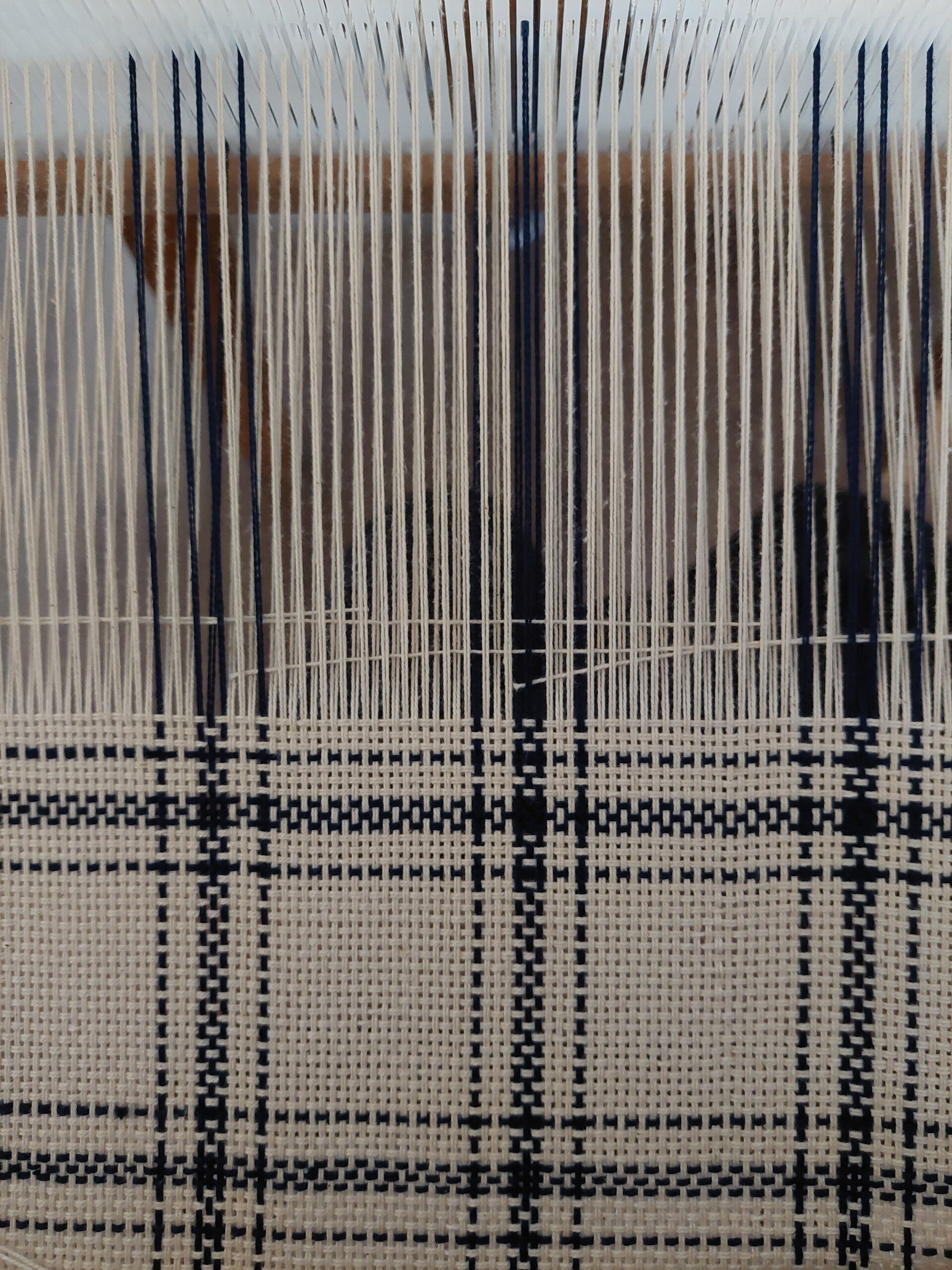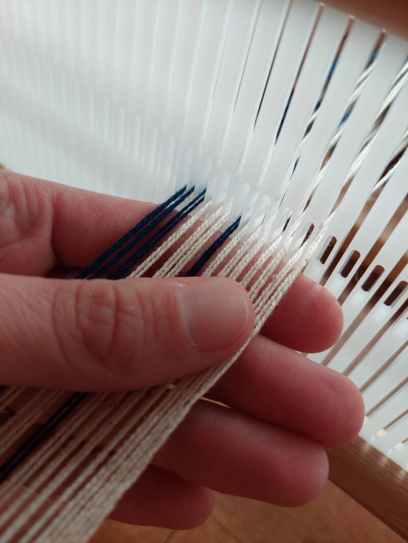 Nu komt het leukste gedeelte! Het weven kan beginnen. De eerste paar centimeter zijn altijd even inkomen en het garen "leren kennen". Ieder garen heeft zijn eigen eigenschappen en gebruikswijze. Bij dit katoen merkte ik dat ik al snel de juiste spanning met aanslaan van het riet te pakken had. En toen was het een kwestie van goed tellen zodat ik genoeg witte draden had ingeslagen om vervolgens met de blauwe draden verder te gaan en deze af te wisselen met de witte.