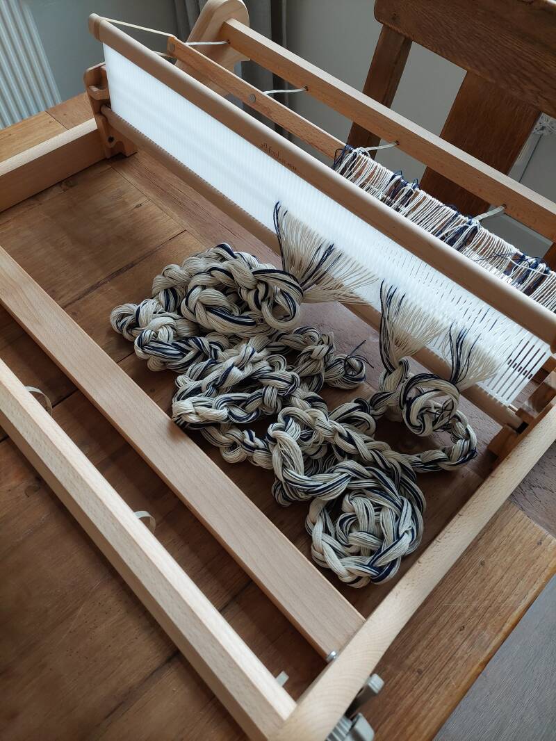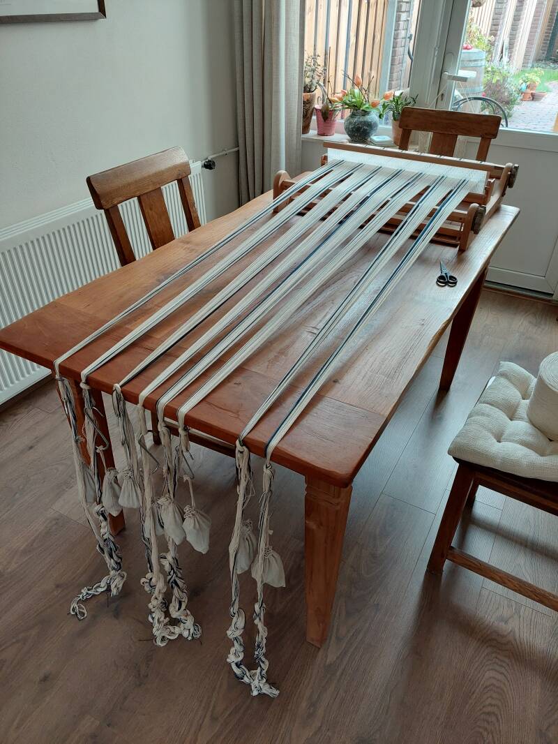 Halverwege! De bundels draden die leg ik veilig weg. Dit proces van schering maken duurt behoorlijk lang en is fysiek intensief waardoor ik het vaak maar een kwartier of half uur achtereen kan doen.