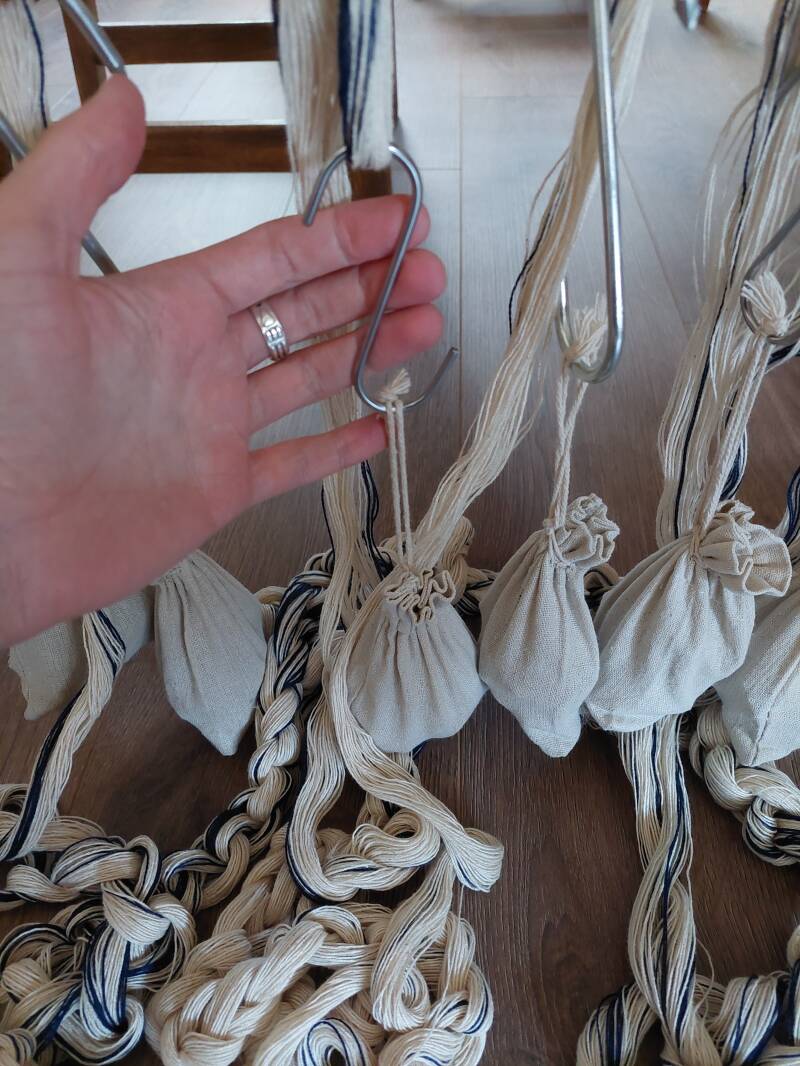 Aan de bundels met draden maak ik een overhandse lusknoop. Hier hang ik een S haak aan met een zakje met gewicht.