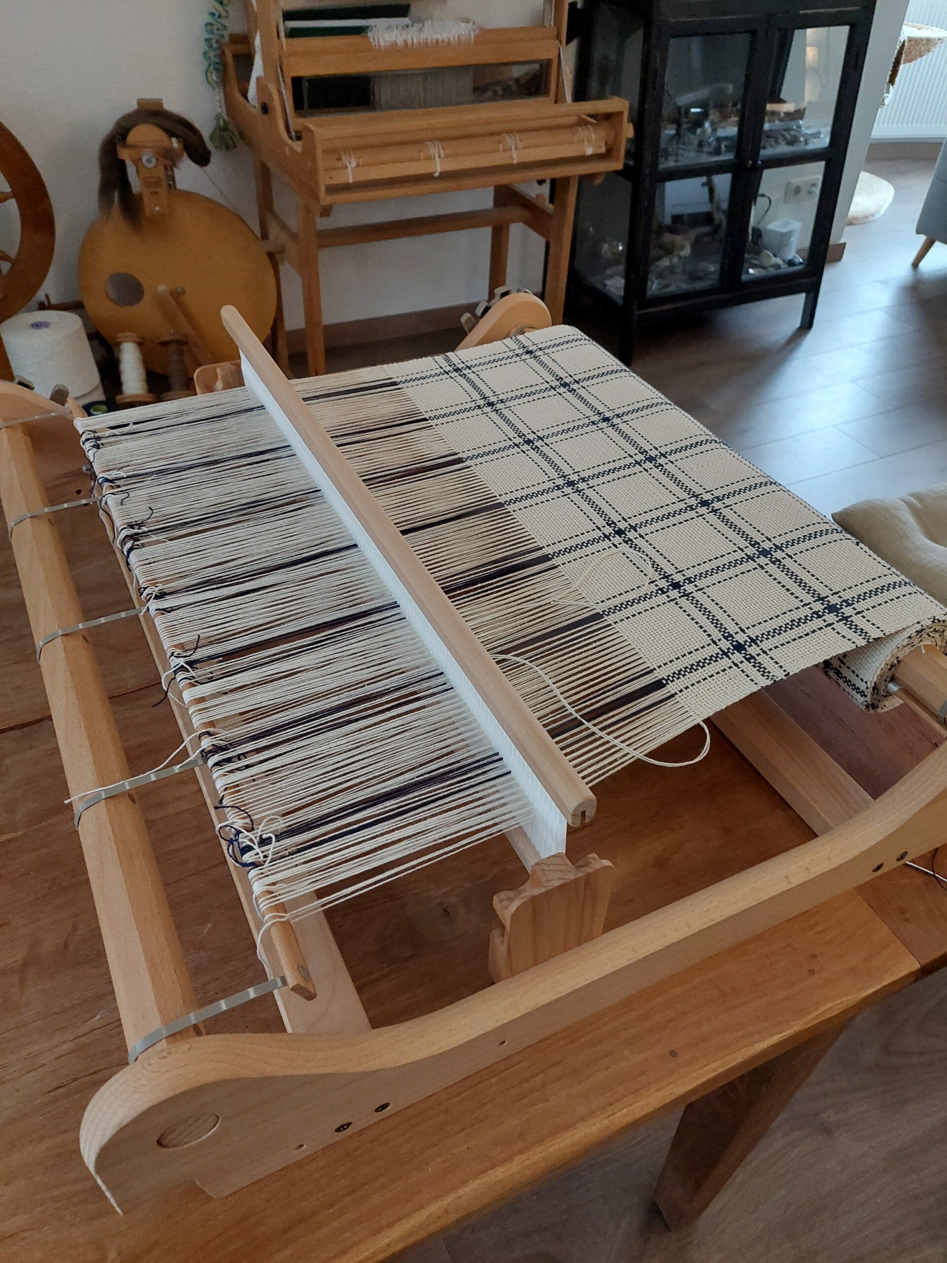 Getouw: Ashford hevelriet (rigid heddle in het Engels) weefbreedte van 60cm.