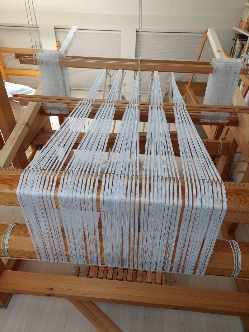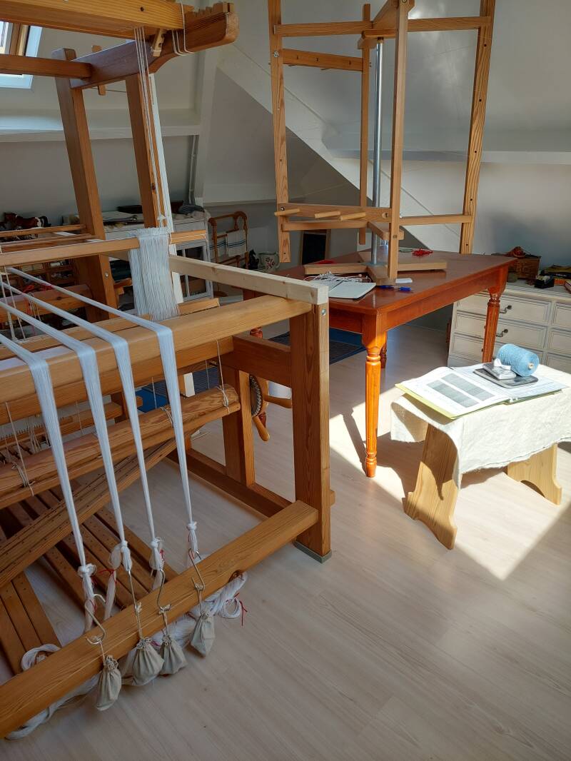Zoals je ziet is het inrijgen van het weefgetouw een hele klus. Iedere stap moet geconcentreerd en secuur worden gedaan, want als er één fout in zit ga je dat meteen zien in je weefsel. En voorkomen is beter dan herstellen! Over deze stappen van het inrijgen heb ik ongeveer 2 weken gedaan. Dat is dan wel de ene dag 1 uur, de andere dag 20 minuten en soms dagen niet wanneer mijn lichaam te veel pijn deed (ik heb een bindweefselaandoening wat voor pijn en vermoeidheid in mijn lichaam zorgt). Dus ik doe wat ik kan! En dat bekijk ik per dag.